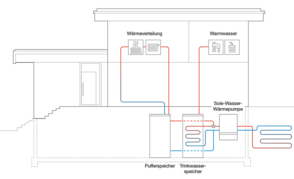 Pufferspeicher ergänzen Wärmepumpen optimal. Eine Wärmepumpe mit Pufferspeicher leitet die überschüssige Wärmeenergie – also die Wärme, die im Haus gerade nicht benötigt wird – mithilfe eines Wärmetauschers in den Speicherbehälter. © Bosch Thermotechnik GmbH, Buderus