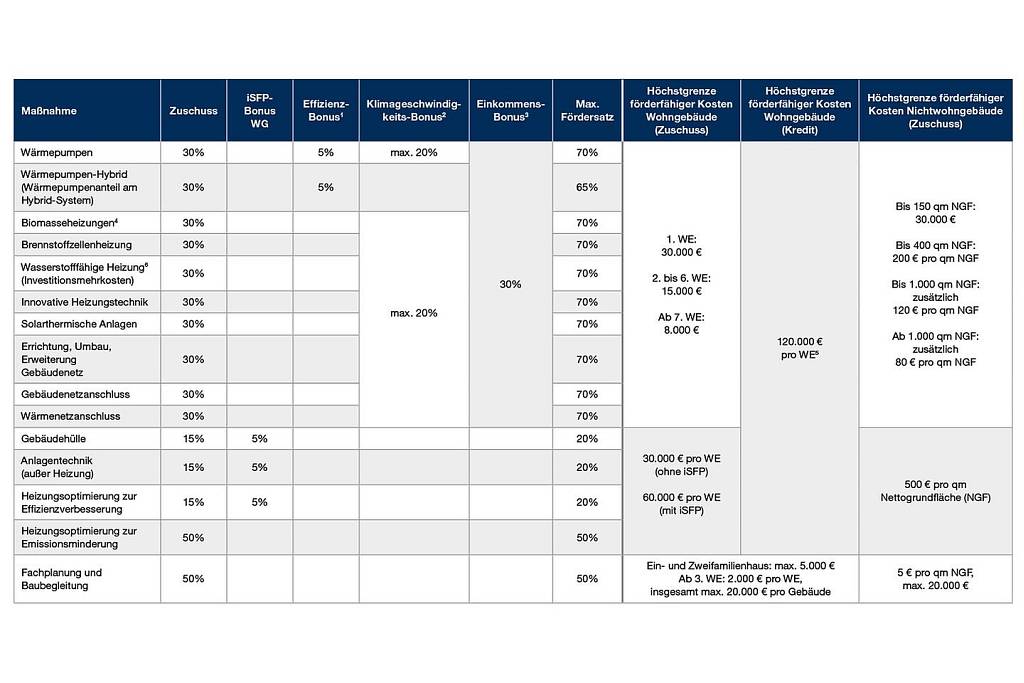 2 20 % bis 31.12.2028, ab 2029 Reduzierung um 3 Prozentpunkte alle zwei Jahre; Klimageschwindigkeitsbonus wird nur für selbstnutzende Eigentümer und nicht für Wärmepumpen-Hybridsysteme gewährt (Beibehaltung von einem fossilen Anteil); Bonus wird für Austausch von funktionstüchtigen Öl-, Kohle-, Gas-Etagen- und Nachtspeicherheizungen (ohne Anforderung an den Zeitpunkt der Inbetriebnahme) oder für den Austausch von Gas- oder Biomasseheizungen älter als 20 Jahre (seit Inbetriebnahme) gewährt. Nach dem Austausch der Heizung darf das Gebäude nicht mehr mit fossilen Brennstoffen beheizt werden.
